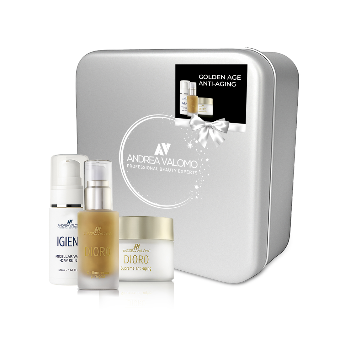 Coffret composto por 3 produtos: MICELLAR WATER - DRY SKIN (50ml) Solução micelar, para peles secas e sensíveis, com perfume hipoalergénico e sem detergentes. Remove as impurezas e maquilhagem, mantendo a hidratação e reforçando a barreira epidérmica. SUBLIME SERUM PURE GOLD (30ml) Concentrado para peles maduras que atenua a apariência de sinais de envelhecimento, tais como as rugas profundas e as manchas pela presença dos ativos branqueador, bioplasma e ácido hialurónico. SUPREME ANTI-AGING (50ml) é um creme, com filtro solar, que aporta conforto, nutrição e efeito rejuvenescedor à pele pela presença de ativos como o retinol, ácido hialurónico e extrato de placton. MODO DE APLICAÇÃO PASSO 1: de manhã e à noite, aplicar a Micellar Water - dry skin em discos de algodão e higienizar o contorno ocular, lábios, rosto, pescoço e decote. Não usar água. PASSO 2: de manhã e à noite, aplicar o Sublime Serum Pure Gold no rosto, pescoço e decote, massajando até à sua completa absorção. PASSO 3: de manhã e à noite, aplicar o Supreme Anti-Aging no rosto, pescoço e decote, massajando até à sua completa absorção. |