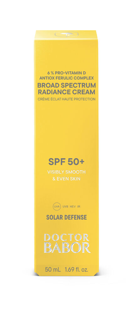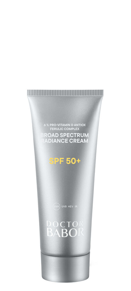 Os resultados visíveis estão no centro de cada fórmula BABOR. Com proteção de amplo espetro SPF 50+ e 6% Pro-Vitamin D Antiox Ferulic Complex, o DOCTOR BABOR SOLAR DEFENSE Broad Spectrum Radiance Cream SPF 50+ ajuda a prevenir o envelhecimento cutâneo induzido pelo sol, enquanto a ectoína contribui para a proteção da matriz extracelular (ECM) e ajuda a reduzir a degradação do colagénio, para uma pele com aspeto visivelmente mais jovem. Com proteção UVA/UVB e um complexo de proteção contra luz azul e infravermelhos, ajuda a defender a pele, ao mesmo tempo que melhora a hidratação e a suavidade. Enriquecido com o exclusivo DOCTOR BABOR BIOGEN PLANT EXTRACT, este produto apoia o aspeto natural da pele e promove uma pele luminosa e com aparência mais jovem. O Broad Spectrum Radiance Cream SPF 50+ proporciona uma sensação de pele nutrida e protegida. A sua textura delicada funde-se na pele, deixando-a confortável e nutrida. A experiência olfativa, que combina frescura com um delicado bouquet floral e notas amadeiradas, completa este momento de cuidado. Este produto foi desenvolvido por especialistas BABOR nos laboratórios da empresa em Aachen, na Alemanha, com base no “conscious standard” da BABOR. Made in Germany é sinónimo da elevada qualidade deste produto e de toda a empresa. Para uma pele mais resistente, bem hidratada e equilibrada — mesmo sob stress ambiental diário. Ingredientes ativos Filtros químicos de elevada proteção UVA/UVB utilizados para uma proteção de amplo espetro: Diethylamino Hydroxybenzoyl Hexyl Benzoate, Ethylhexyl Triazone, Phenylbenzimidazole Sulfonic Acid e Bis-Ethylhexyloxyphenol Methoxyphenyl Triazine A Pró-Vitamina D é um esterol e um precursor da vitamina D3, naturalmente presente na pele. Ajuda a manter a integridade da ეპiderme e a preservar a função de barreira, essencial para proteger a pele contra os agressores ambientais. O complexo com ácido ferúlico ajuda a reforçar a barreira cutânea e a apoiar a proteção contra influências ambientais, mesmo em condições de stress. A ectoína, um extremólito de origem natural, ajuda a proteger a pele da degradação da ECM e do colagénio relacionada com o stress oxidativo, através da redução da expressão de MMP, ao mesmo tempo que apoia a proteção da pele contra o stress oxidativo induzido pela luz. O extrato de microalga rosa (Dunaliella salina), proveniente de lagos salinos e ambientes marinhos ricos em sal, é conhecido pelas suas propriedades antioxidantes e de suporte da barreira cutânea, bem como pelo seu elevado teor de carotenoides, em particular β-caroteno, que esta microalga produz como mecanismo de proteção contra a radiação solar intensa e o stress ambiental. Ajuda a proteger a pele do stress oxidativo causado pela exposição ambiental e apoia a função de barreira da pele, ajudando a manter a integridade da epiderme para uma pele com aspeto mais resistente e equilibrado. O pantenol ajuda a melhorar a hidratação da pele e a acalmar a pele seca e fragilizada, reduzindo o aspeto de rídulas e de vermelhidão ligeira associada à secura. Deixa a pele com um toque sedoso, suave e luminoso. A L-arginina, um aminoácido, ajuda a equilibrar a hidratação ao apoiar a barreira protetora da pele, retendo a humidade. Além disso, contribui com propriedades antioxidantes que ajudam a proteger contra o envelhecimento cutâneo prematuro induzido pelo sol. O requintado BIOGEN PLANT EXTRACT é derivado de 8 plantas de diferentes géneros. Foi estudado e continuamente aperfeiçoado ao longo dos anos. Modo de aplicação Advertências |