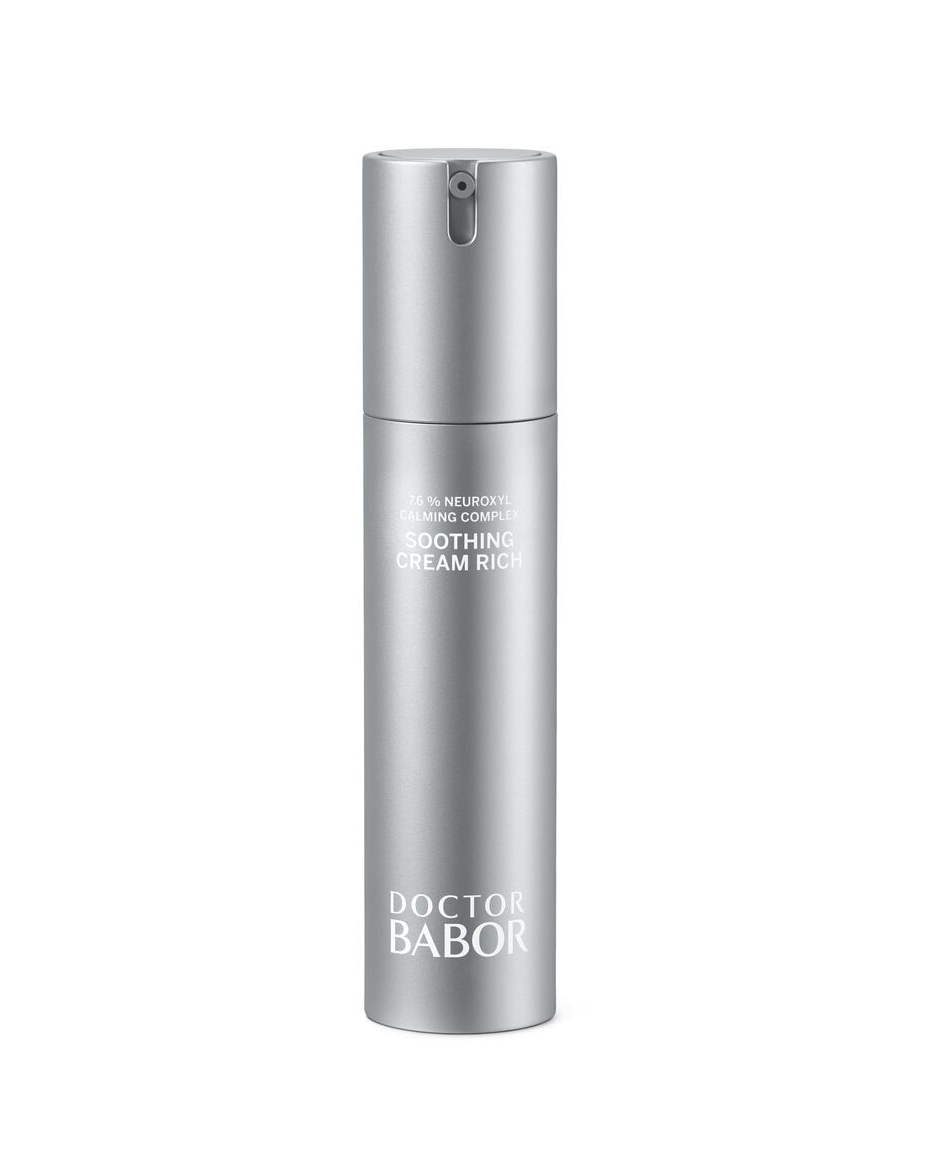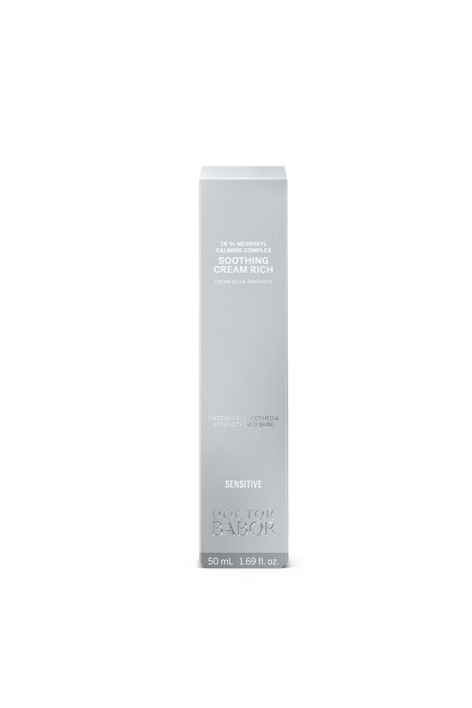 O DOCTOR BABOR SENSITIVE Soothing Cream Rich, enriquecido com um complexo calmante de 7,6% composto por extratos vegetais suavizantes, ingredientes hidratantes e microprata, reduz a comichão, a vermelhidão e alivia a sensação de tensão da pele. A textura rica do Soothing Cream Rich proporciona um cuidado intensivo e uma sensação de nutrição profunda. A sua formulação compatível com a pele pode também ser usada para apoiar o cuidado da dermatite atópica no rosto e no corpo durante as fases sem sintomas. Efeito O cuidado rico com Neuroxyl, prata e extratos vegetais valiosos nutre e acalma intensamente a pele vermelha, irritada e com comichão, ajudando-a a recuperar o equilíbrio natural. Ingredientes de alto desempenho equilibram e fortalecem a pele, reduzindo comprovadamente a sensibilidade e protegendo a função barreira. A pele fica profundamente hidratada, mais lisa, relaxada e resistente. Enriquecido com o exclusivo Extrato Vegetal BIOGEN, resultado máximo da investigação BABOR, estimula os processos naturais da pele e promove a sua vitalidade e juventude. Este creme particularmente rico, com o Complexo Calmante, acalma e protege a pele seca e muito irritada, sujeita a sensações de tensão. A comichão e a irritação são eficazmente atenuadas, enquanto a pele é intensamente hidratada e a barreira cutânea reforçada. O resultado é uma pele nutrida, equilibrada e confortável. Aplicar no rosto, pescoço e decote, massajando suavemente de manhã e à noite após a limpeza com o DOCTOR BABOR Soothing Cream Cleanser e, preferencialmente, depois do DOCTOR BABOR Itch Relief Serum ou do DOCTOR BABOR Instant Soothing Ampoule Serum Concentrate.