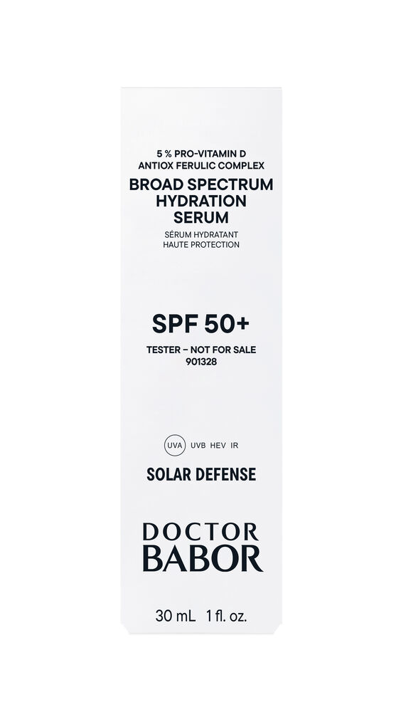 Com proteção de largo espetro SPF 50+ e 5% Pro-Vitamin D e Antiox Ferulic Complex, o DOCTOR BABOR SOLAR DEFENSE Broad Spectrum Hydration Serum ajuda a prevenir o envelhecimento cutâneo induzido pelo sol, enquanto a ectoína contribui para a proteção da matriz extracelular (ECM) e ajuda a reduzir a degradação do colagénio, para uma aparência visivelmente mais jovem. Com proteção UVA/UVB e um complexo de proteção contra luz azul e infravermelhos, ajuda a defender a pele, ao mesmo tempo que melhora a hidratação e a suavidade. Enriquecido com o exclusivo DOCTOR BABOR BIOGEN PLANT EXTRACT, o produto ajuda a melhorar a hidratação da pele, para uma pele mais suave e luminosa. O Broad Spectrum Hydration Serum SPF 50+, sem fragrância, proporciona uma sensação leve e protegida na pele. A textura delicada funde-se na pele e deixa-a confortável e hidratada. Este produto foi desenvolvido por especialistas BABOR nos laboratórios da empresa em Aachen, Alemanha, com base no “conscious standard” da BABOR. Para uma pele mais resistente, bem hidratada e equilibrada, mesmo sob o stress ambiental diário. Ingredientes ativos: A L-arginina, um aminoácido, ajuda a equilibrar a hidratação ao apoiar a barreira protetora da pele, retendo a humidade. Também contribui com propriedades antioxidantes. O requintado BIOGEN PLANT EXTRACT é obtido a partir de 8 plantas de diferentes géneros. Tem sido estudado e continuamente aperfeiçoado ao longo de vários anos. A ECTOÍNA, um extremólito de ocorrência natural, ajuda a proteger a pele contra a degradação da ECM e do colagénio relacionada com o stress oxidativo, através da redução da expressão de MMP, ao mesmo tempo que apoia a proteção da pele contra o stress oxidativo induzido pela luz, ajudando a manter uma aparência jovem. Modo de aplicação Advertências Filtros químicos UVA/UVB de elevada proteção, utilizados para proteção de largo espetro: |